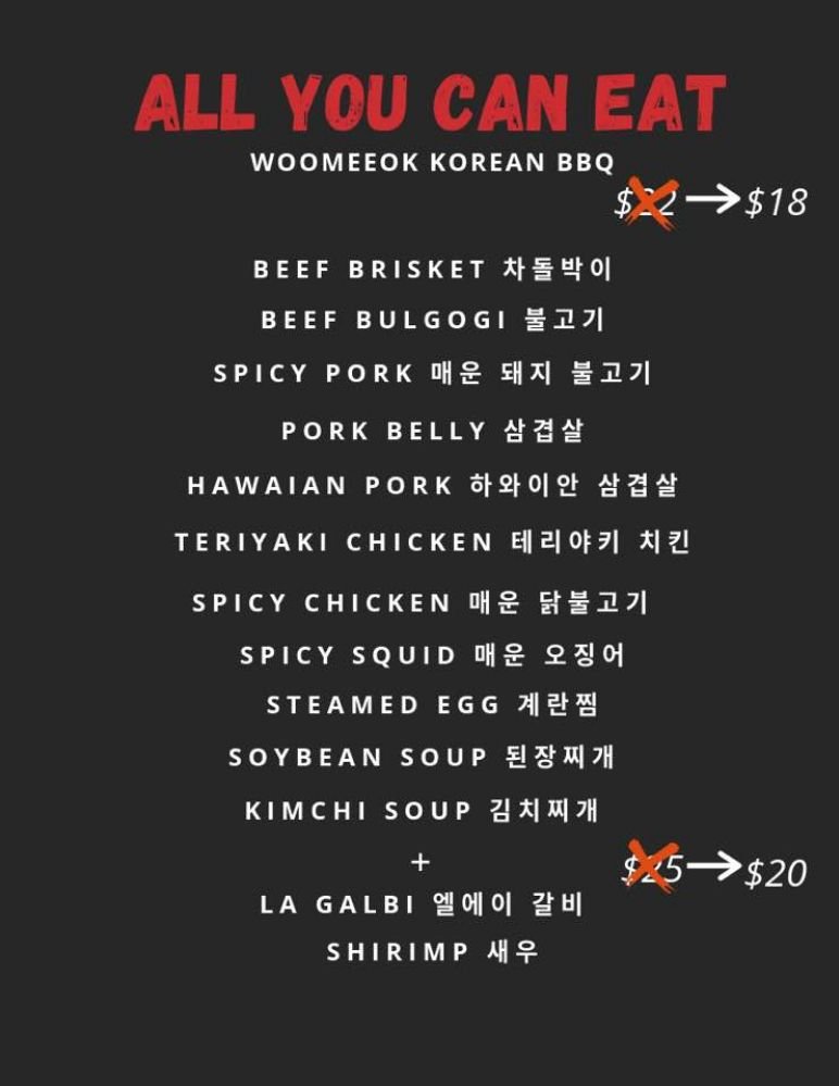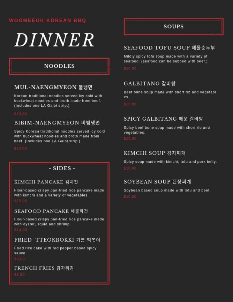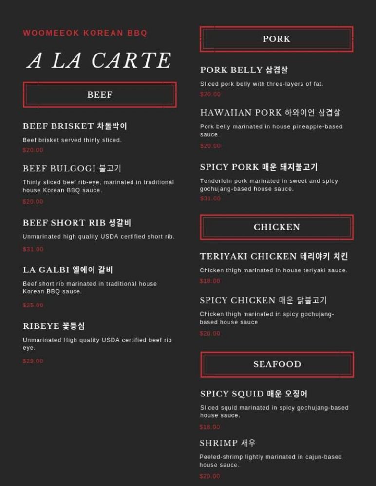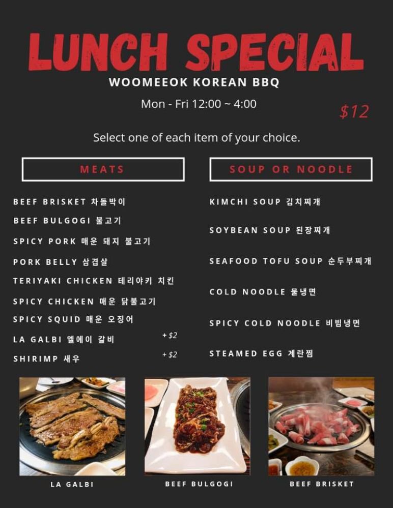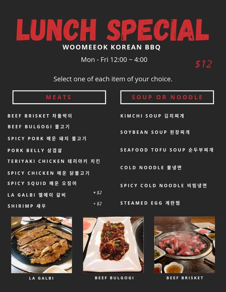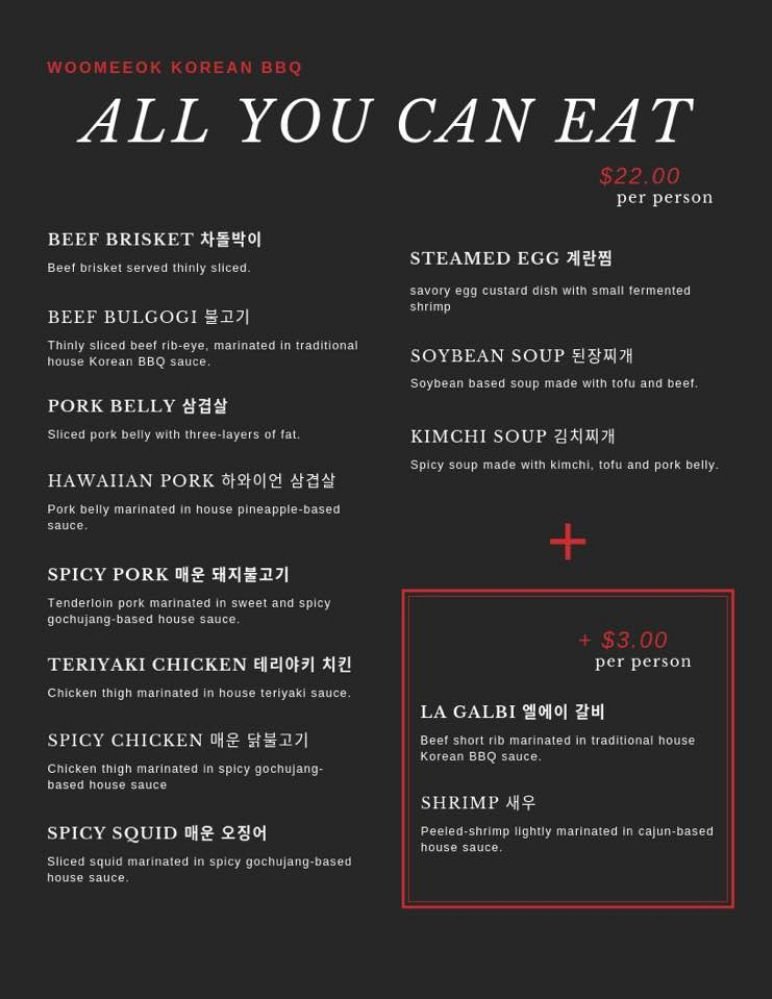 Introducing the menu at Woo Mee Ok Korean BBQ, located in Dallas, TX, where you can find a variety of delicious Korean dishes. From appetizers like Kimchi Pancake to Seafood Tofu Soup and Bulgogi Lunch, there is something for everyone. Customers rave about the all-you-can-eat BBQ options and the attentive service provided by the staff. The cozy ambiance and abundance of side dishes add to the dining experience, making it a top choice for KBBQ enthusiasts. With a focus on quality meats and generous portions, Woo Mee Ok offers a great value for your money. Whether you're a meat lover or prefer vegetarian options, this restaurant caters to all preferences. Don't miss out on the opportunity to indulge in flavorful Korean cuisine at Woo Mee Ok Korean BBQ.